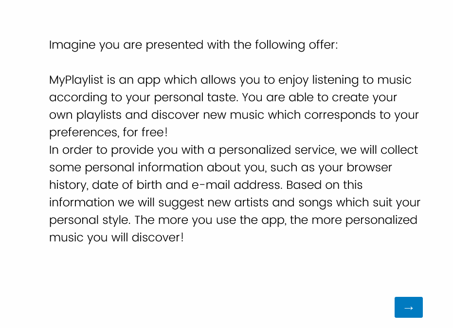 To answer those questions we conducted an experimental vignette study where we presented participants with hypothetical scenarios describing an offer of a music streaming mobile application. Participants were assigned to four groups. One group read that the app is free and that users’ data are collected to personalize services. The other group read that the app is free but users’ data are collected to personalize advertisement. Importantly, the content of personalized services and advertisement did not differ – in both cases users would receive suggestions of new artists and songs. The other two groups were informed that the app costs €9.99/month and either include personalized advertisement or personalized services.