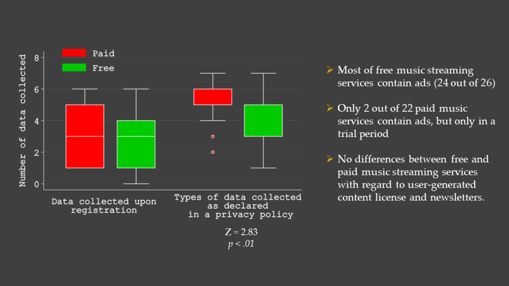 To answer those questions we conducted an experimental vignette study where we presented participants with hypothetical scenarios describing an offer of a music streaming mobile application. Participants were assigned to four groups. One group read that the app is free and that users’ data are collected to personalize services. The other group read that the app is free but users’ data are collected to personalize advertisement. Importantly, the content of personalized services and advertisement did not differ – in both cases users would receive suggestions of new artists and songs. The other two groups were informed that the app costs €9.99/month and either include personalized advertisement or personalized services.
